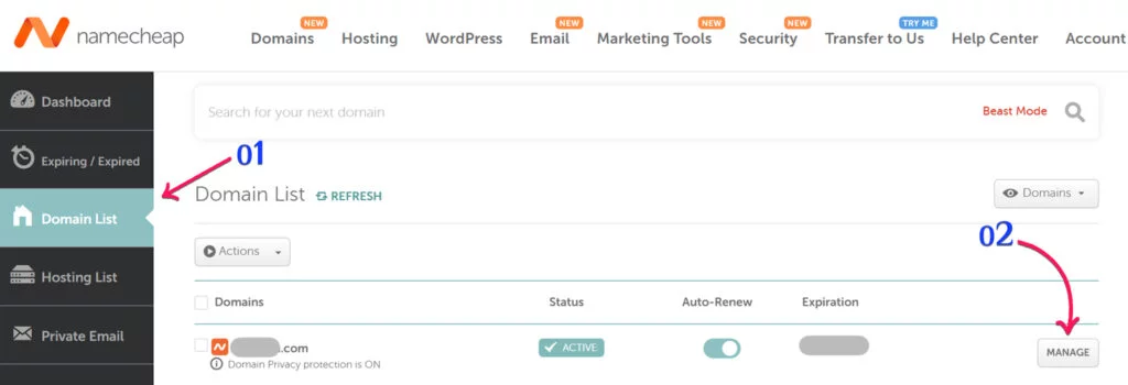 سجل الدخول لحسابك، في القائمة الجانبية اذهب لقسم “Domain List”، اختر الدويمن المقصود واضغط على زر “MANAGE”.