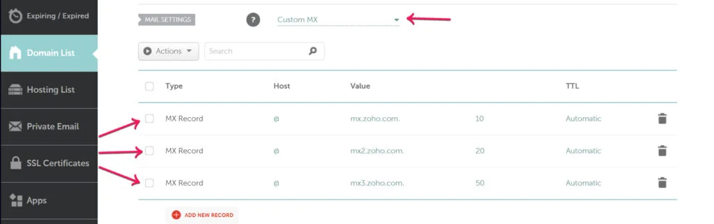 انزل للأسفل وبالتحديد عند خيار “MAIL SETTINGS”. قم بتدبيله من القائمة إلى “Custom MX” كما هو موضح في الصورة الأسفل. أسفلها قم بإضافة البيانات التالية: