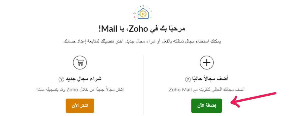 المنصة تقدم لك خيارين: إما إضافة نطاق تملكه مسبقا أو شراء نطاق جديد مباشرة من منصة زوهو. بما أننا نملك نطاقا بالفعل، سنختار الخيار الأول.