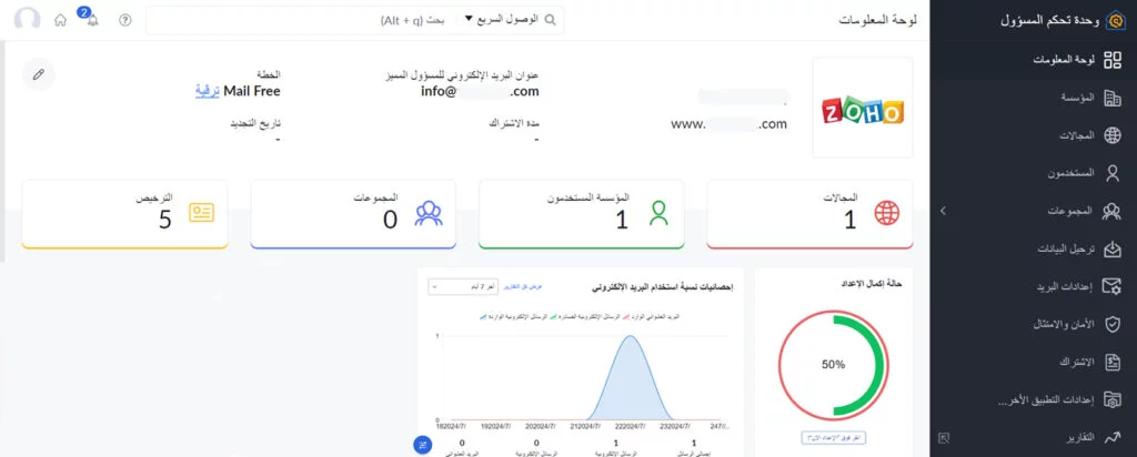 بعد إكمال جميع الإعدادات الثانوية الأخرى، أو تأجيلها لوقت لاحق، ستجد نفسك في الصفحة التي تحتوي على جميع الإعدادات التي يمكنك التحكم بها لإنشاء بريد احترافي على Zoho، رابط هذه الصفحة على الشكل التالي (mailadmin.zoho.com/cpanel).