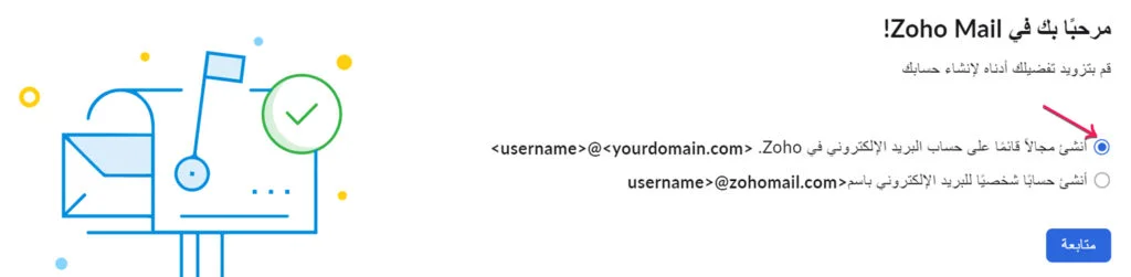 الخطوة القادمة هي إعداد بريد إلكتروني احترافي لموقعنا. ستعرض الأداة خيارين، وبالتأكيد الأول الذي يتيح لنا إنشاء بريد إلكتروني باستخدام رابط النطاق هو ما نريده. حدد هذا الخيار ثم اضغط على “المتابعة”.