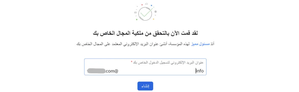 بعد أن تتأكد المنصة من أنك المالك الرسمي لاسم النطاق، ستنتقل مباشرة إلى الصفحة التي يمكنك من خلالها إنشاء بريد إلكتروني مثل info أو أي اسم آخر تابع للنطاق. ببساطة اكتب الصيغة التي تناسبك ثم اضغط على زر “إنشاء”.