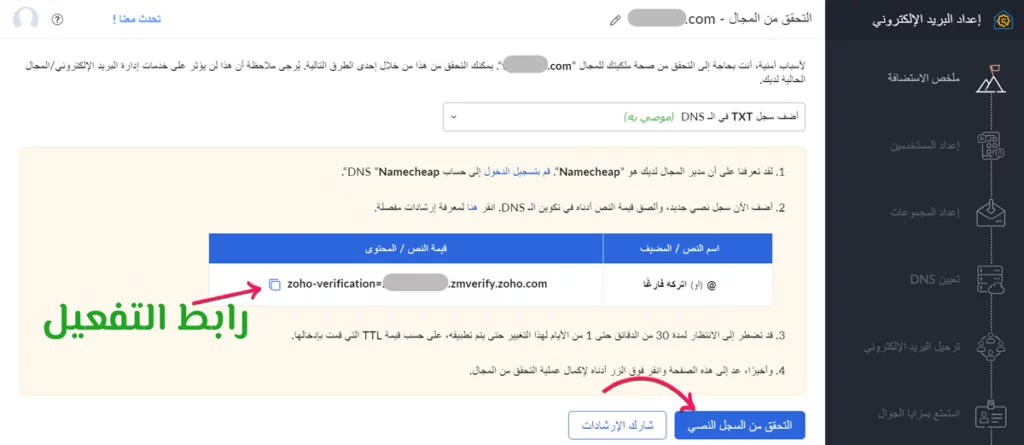 وأخيرا، كخطوة نهائية ليصبح بريدك مؤهل للاستخدام، عد إلى صفحة التفعيل في منصة Zoho التي توقفنا عندها سابقا، واضغط على زر “التحقق من السجل النصي”. لاحظ أنه قد يستغرق بعض الوقت حتى يتم الربط بين Namecheap ومنصة Zoho Mail، وقد يستغرق ذلك بضع دقائق أو حتى عدة ساعات.