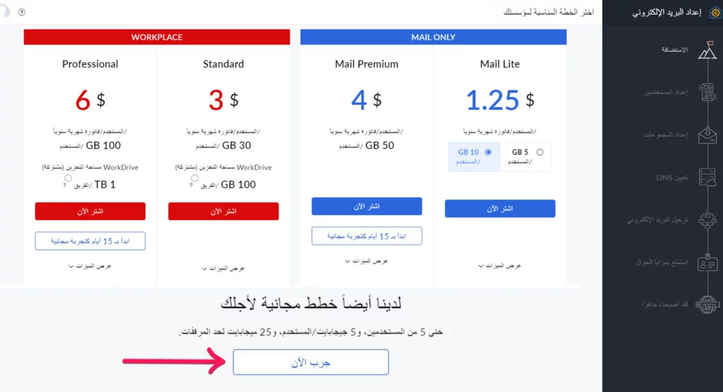 سيتم تحويلك إلى الصفحة التالية التي تضم جميع أسعار الاشتراكات التي توفرها المنصة. وبما أنك تبحث عن كيفية إنشاء بريد احترافي مجانا، سنكتفي بالخطة المجانية التي تتيح لنا إنشاء ما يصل إلى 5 مستخدمين، مع 5 جيجابايت لكل مستخدم، و25 ميجابايت كحد أقصى للمرفقات.