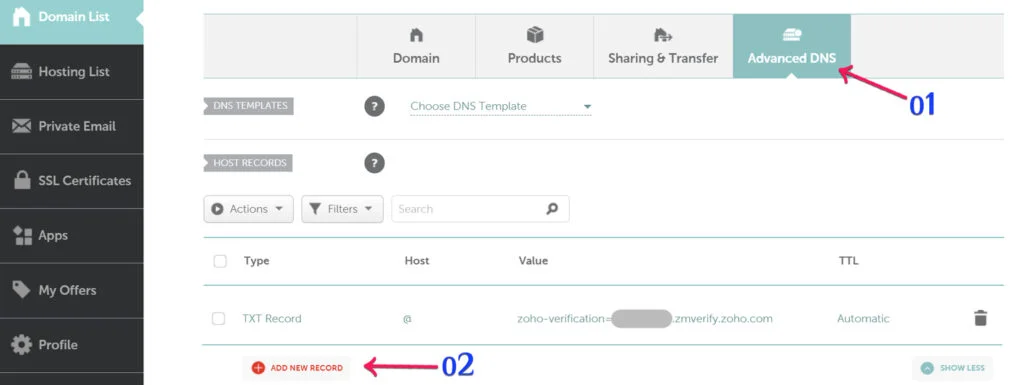 بعدها اذهب مع خيار “Advanced DNS”، ثم اضغط على خيار “ADD NEW RECORD” كما يظهر في الصورة الأسفل، واتبع الخطوات التالية: