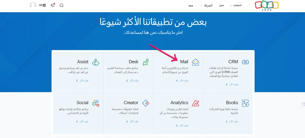 مع العلم أن منصة Zoho تتوفر على أكثر من 55 تطبيق في مجالات مختلفة، وما يهمنا الآن هي Mailـ اضغط على زر “جرب الآن”.