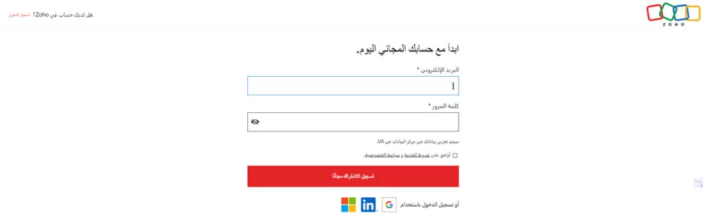 أولا نقوم بتسجيل حساب جديد على منصة زوهو، وكالعادة ستحتاج لبريد إلكتروني عادي مع كلمة سر قوية (مزيج من الحروف الكبيرة والصغيرة والأرقام والرموز). ولا تنسى التعليم على خانة أوافق على شروط الخدمة والخصوصية.