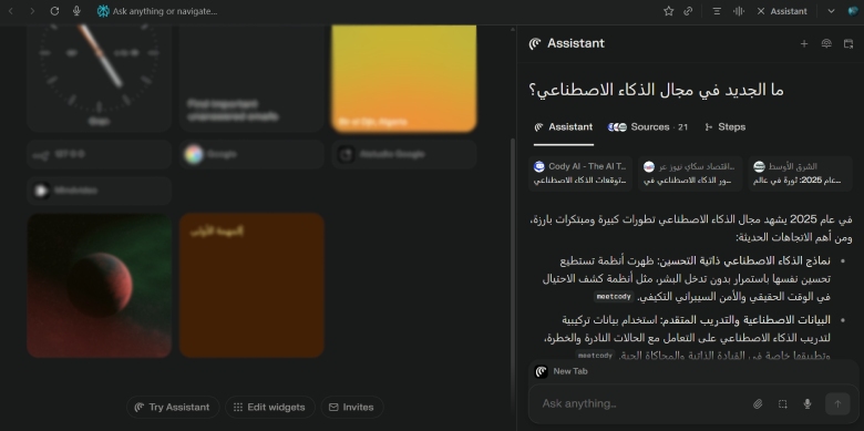 - المساعد الذكي المدمج: في المتصفحات المعتادة، لا يوجد مساعد ذكي إلا عبر إضافات خارجية (البعض صار يدعمها). أما Comet فيأتي بمساعد مدمج داخل المتصفح نفسه، يمكنه تلخيص الصفحات، والإجابة عن الأسئلة، وتنفيذ المهام نيابة عنك.