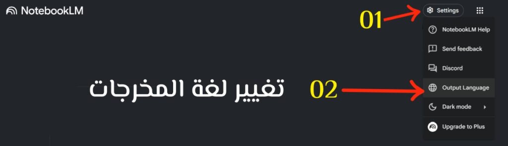 ملاحظة: للحصول على أفضل النتائج باللغة العربية، وخاصة عند توليد البودكاست بالعربية، يجب أولا تحديد العربية كلغة إدخال رئيسية في إعدادات Notebook LM، فقط اضغط على أيقونة الإعدادات، وبالتحديد في في خيار Output Language حدد “العربية”. ولتحسين النتائج أكثر، نوصي بتغيير لغة حساب في جوجل للعربية.