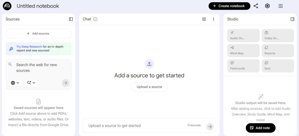 نعم، يمكنك استخدام Notebook LM مجانا بكل سهولة، كل ما تحتاجه هو حساب جيميل. النسخة المجانية تسمح لك بإنشاء دفاتر ورفع مصادر والعمل عليها مباشرة دون دفع أي رسوم.